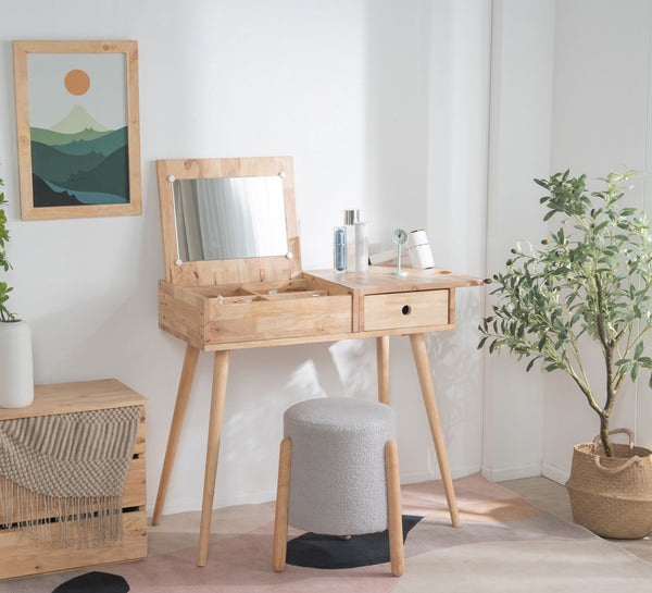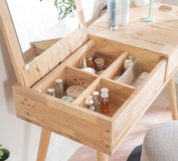 Elevate your daily routine with this beautifully crafted wooden vanity table, designed for both style and practicality. Its sleek, minimalist design makes it a perfect fit for modern bedrooms, while the smart storage compartments keep all your essentials organised. Compact yet versatile, this 2-in-1 vanity table is ideal for small apartments, bedrooms, or dressing areas—bringing both beauty and function into your everyday life.